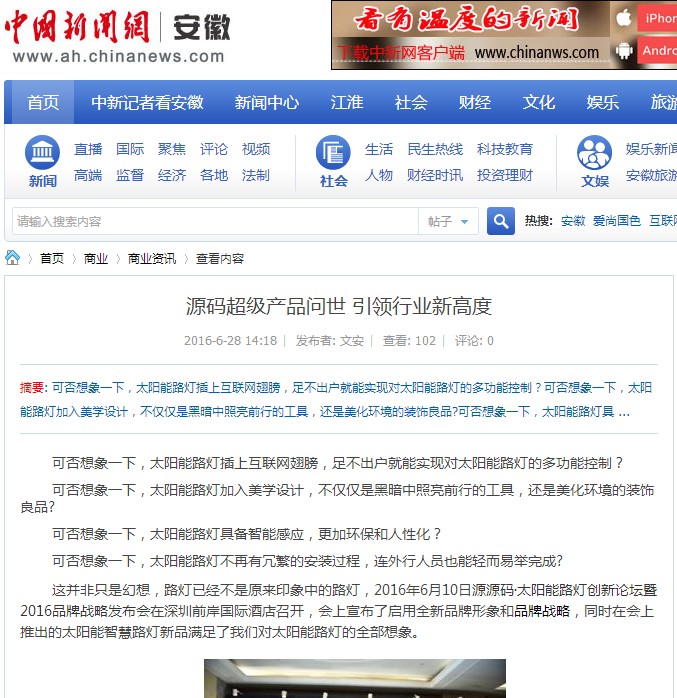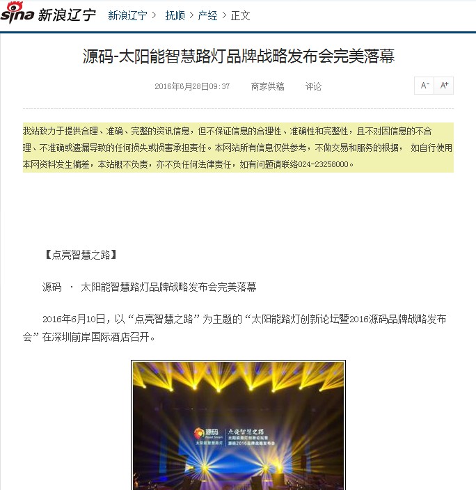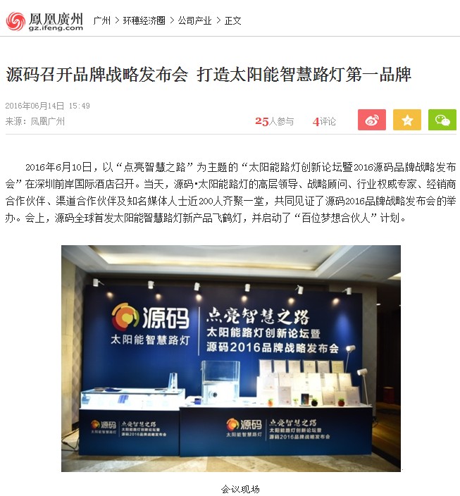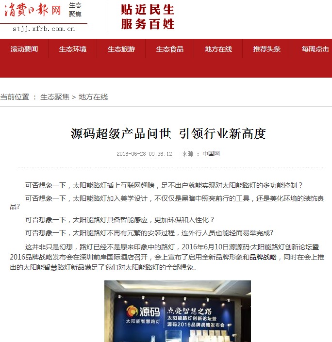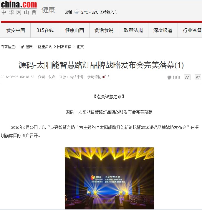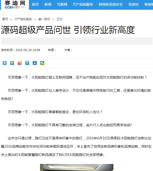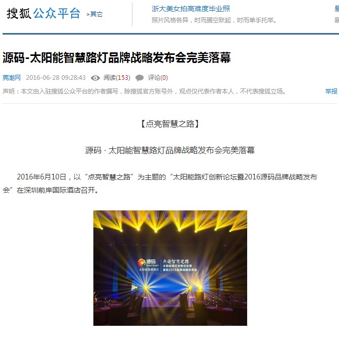 繼源碼在深圳成功舉行太陽能路燈創(chuàng)新論壇暨源碼2016品牌戰(zhàn)略發(fā)布會后,引起了各大媒體和行業(yè)的廣泛關(guān)注,行業(yè)專家柴鈺教授表示,此次源碼發(fā)布會已經(jīng)顛覆了行業(yè)對傳統(tǒng)太陽能路燈的認(rèn)知,對太陽能路燈行業(yè)的發(fā)展指明了方向。在各大媒體的爭相報道下,網(wǎng)上掀起一片關(guān)于“源碼”的信息狂潮。