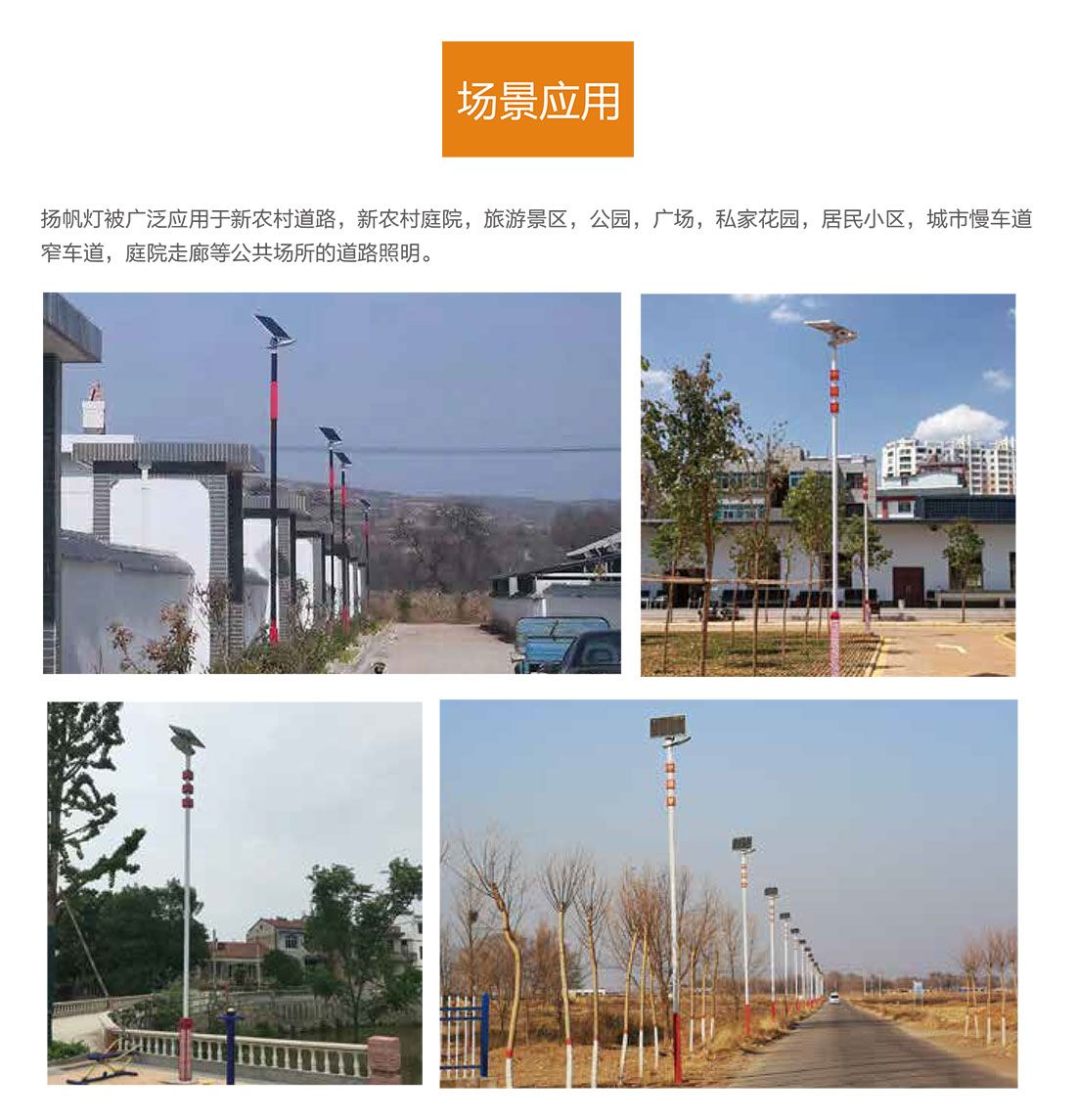 揚帆燈作為一體化太陽能路燈,被廣泛應(yīng)用于新農(nóng)村道路、旅游景區(qū)、公園、廣場、居民小區(qū)、城市慢車道/窄車道等場景。