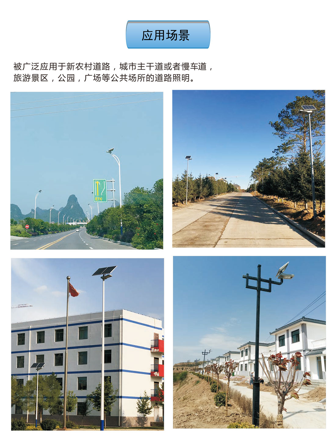 夜鷹燈作為高性價(jià)比中高功率一體化太陽(yáng)能路燈,被廣泛應(yīng)用于新農(nóng)村道路、鄉(xiāng)鎮(zhèn)道路、城市主干道或者慢車道、旅游景區(qū)、廣場(chǎng)、工業(yè)園區(qū)等場(chǎng)景。