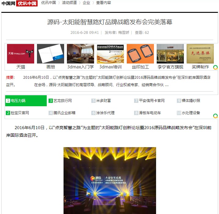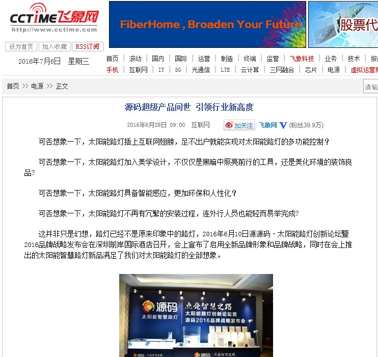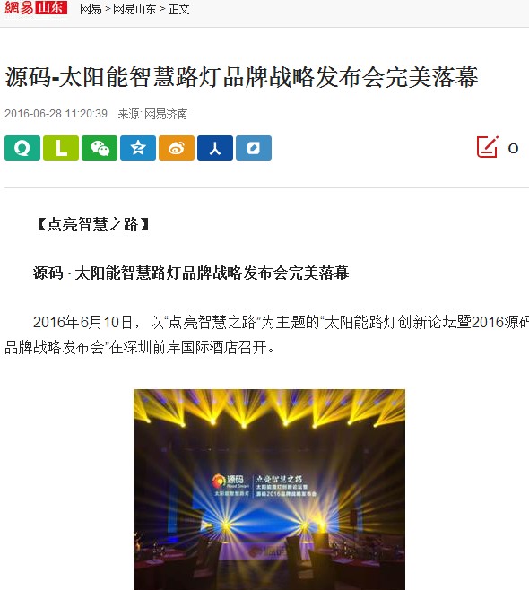 繼源碼在深圳成功舉行太陽能路燈創(chuàng)新論壇暨源碼2016品牌戰(zhàn)略發(fā)布會后,引起了各大媒體和行業(yè)的廣泛關(guān)注,行業(yè)專家柴鈺教授表示,此次源碼發(fā)布會已經(jīng)顛覆了行業(yè)對傳統(tǒng)太陽能路燈的認(rèn)知,對太陽能路燈行業(yè)的發(fā)展指明了方向。在各大媒體的爭相報道下,網(wǎng)上掀起一片關(guān)于“源碼”的信息狂潮。