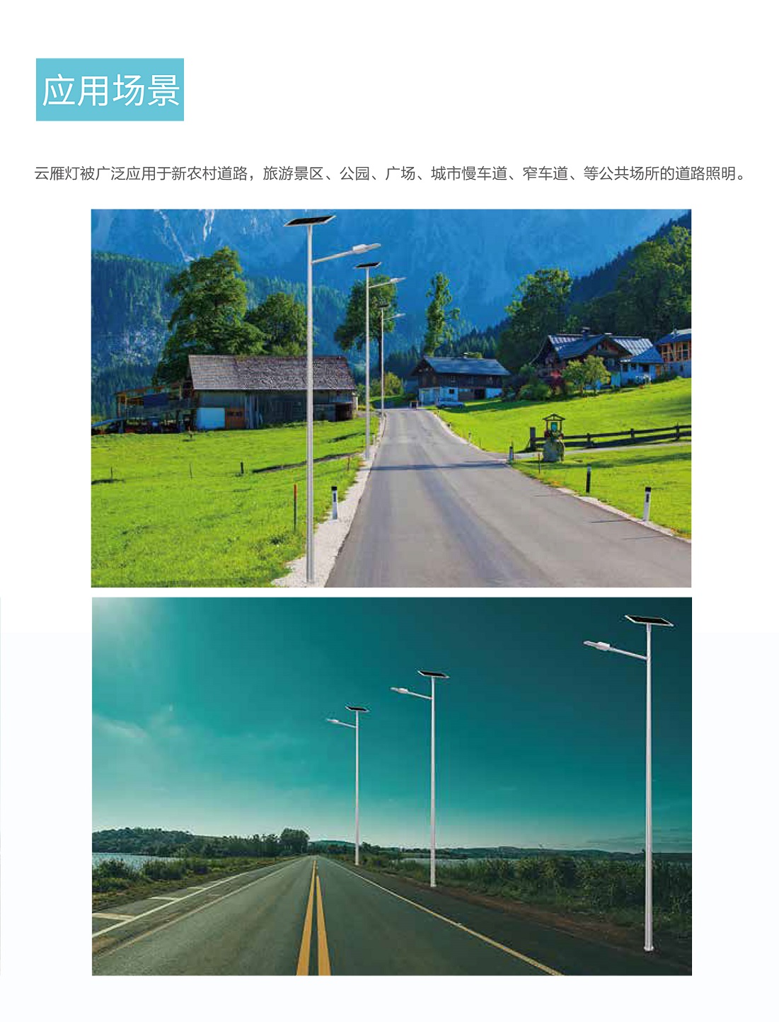 云雁燈作為分體式太陽能路燈,被廣泛應用于新農(nóng)村道路、鄉(xiāng)鎮(zhèn)道路、城市窄車道,以及傳統(tǒng)太陽能路燈替換等場景。